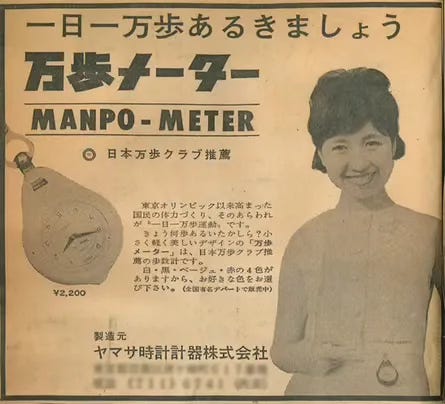 Trackers muddy the waters here too. We’re told that “1h of exercise per day” and “10,000 steps” are enough. But those “10,000 steps” were a marketing invention by a Japanese pedometer manufacturer in 1965 (Manpo-kei, literally “10,000 step counter”). Zero scientific basis.