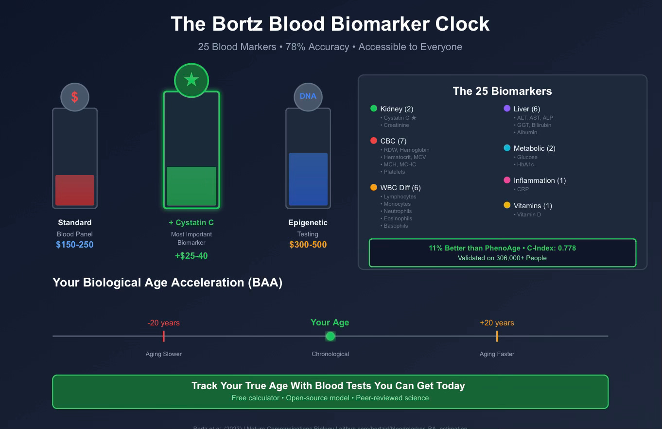 Enter the Bortz model—a breakthrough biological age calculator published in Nature Communications Biology in October 2023 that achieves something remarkable: it estimates your biological age using just 25 standard blood biomarkers, the same ones your doctor likely orders in your annual physical.