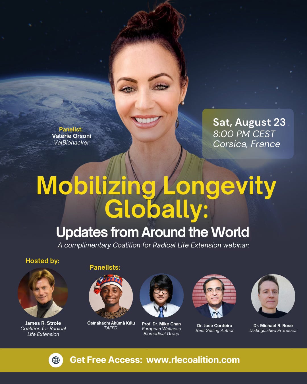 I’m honored to be invited as a panelist at the upcoming Global Longevity Webinar, part of the new Global Longevity Mobilization Project led by James Strole, founder of the Coalition for Radical Life Extension.